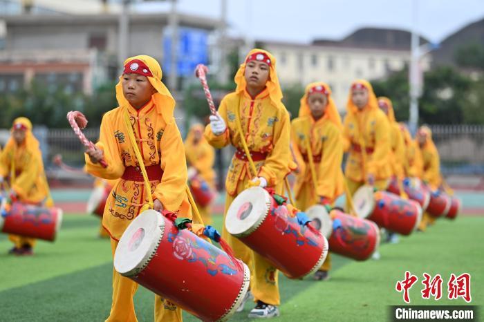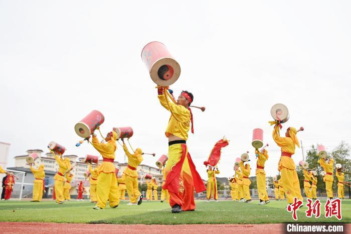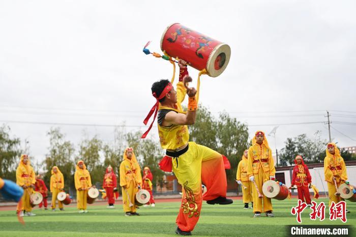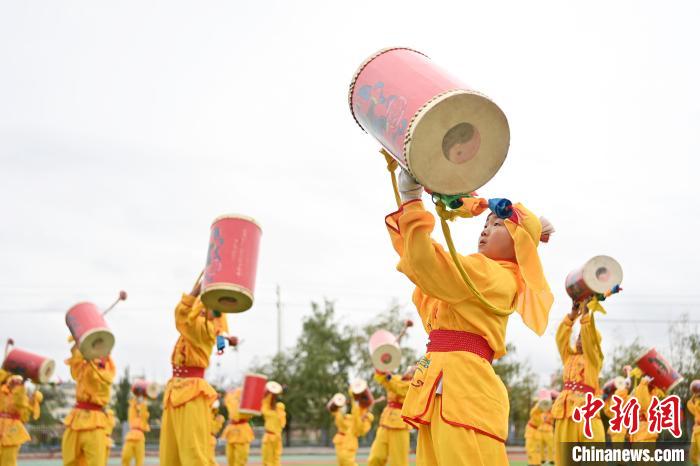 9月9日,甘肅省蘭州市皋蘭縣三川口學(xué)校學(xué)生練習(xí)蘭州太平鼓。近年來(lái),皋蘭縣將國(guó)家級(jí)非物質(zhì)文化遺產(chǎn)蘭州太平鼓納入各中小學(xué)課后服務(wù)內(nèi)容,成立中小學(xué)太平鼓隊(duì)13支,定期邀請(qǐng)非遺傳承人走進(jìn)校園,進(jìn)行傳統(tǒng)文化授課和培訓(xùn),使學(xué)生親身感受中華優(yōu)秀傳統(tǒng)文化的魅力。蘭州太平鼓舞已有六百余年的歷史,素有“天下第一鼓”之稱,2006年被列入中國(guó)第一批非物質(zhì)文化遺產(chǎn)名錄。中新社記者 九美旦增 攝