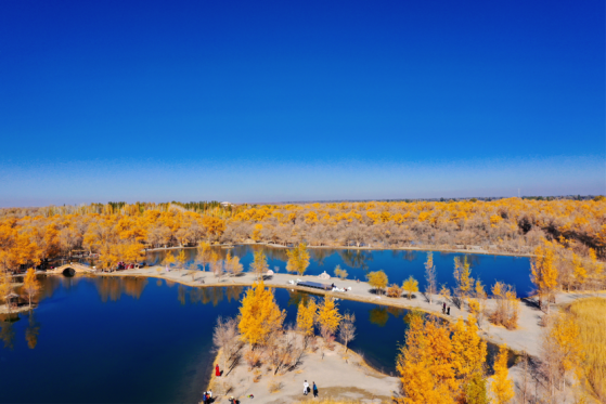 金波湖是金塔胡楊林的心臟,是臨水胡楊的最佳拍攝地之一。湖面倒映著胡楊高大的身影,多姿的樹干,黃色的樹葉,都毫不保留地在水中展示出來。小橋流水、碧波蕩漾、白鵝嬉戲,若不是周邊金黃色的胡楊提醒,會讓人誤以為來到了江南水鄉(xiāng)。