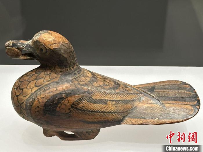 圖為正在展陳的彩繪漆木鳩。 戴文昌 攝