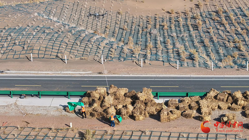 防沙治沙又一季,綠化造林年復年。這幾天,在金塔縣城至大墩門公路“三北”工程防沙治沙現場,一捆捆稻草正排著隊乘坐無人機前往沙漠深處。走進壓沙現場,大家拉草埋沙,手提肩扛,或俯身鋪草,或揮鍬壓埋、填沙整型,分工明確、干勁十足。一臺壓沙車正在作業(yè),車輪駛過,稻草沙障便被植入沙漠里,劃線、鋪草、壓草,整個流程一氣呵成,效率大大提高。