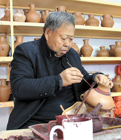64歲的閻建林(見圖,本報(bào)記者趙帥杰攝)是甘肅省級(jí)非物質(zhì)文化遺產(chǎn)項(xiàng)目陶器制作技藝代表性傳承人。走進(jìn)他位于定西市臨洮縣洮陽(yáng)鎮(zhèn)河口村的家中,院落里、窗臺(tái)上,擺滿了大大小小的陶器,足有上百種。“主要是馬家窯彩陶工藝品,敞口的是盆,帶頸的為罐,耳部安有提手的,還可以稱作壺。”閻建林介紹。