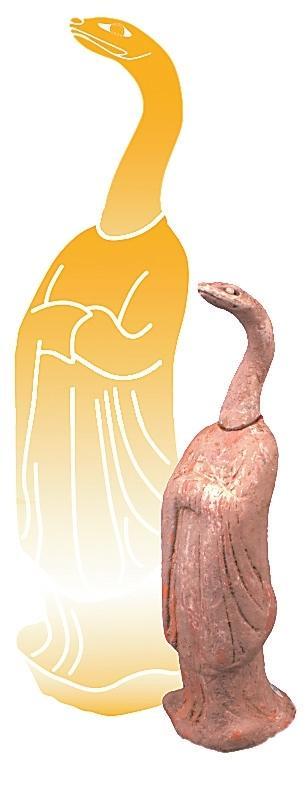 伏羲和女媧是中國神話傳說中的創(chuàng)世神靈,被視為人類文明的始祖。相傳他們均為蛇身人首的形象,象征著自然與人類的和諧統一。伏羲被認為是發(fā)明八卦、結繩記事的智者,開啟了中華文明的智慧之門;而女媧則以其神力摶土造人,煉石補天,維護了天地的秩序。展覽中展出的高臺縣博物館館藏的一件魏晉時期的女媧圖彩繪壁畫磚。畫面繪女媧,人首蛇身,獸足,頭梳高髻,著交領紅裳,右手持月輪,月輪內有蟾蜍,左手持規(guī),周圍繪云氣。同時,還展出了一件高臺縣博物館館藏魏晉時期的伏羲女媧畫像磚,左側女媧,一手持矩、一手拿陰物,人首、蛇身、獸足、挽高髻、著交領長衣,腹部繪月輪;右側伏羲,右手持規(guī),左手持日,內有一金烏,周圍云氣環(huán)生,意在天界暢游。兩磚拼合形成陰陽交合圖,為墓葬中室頂部藻井彩繪圖像。畫像中人首蛇身的伏羲、女媧形象,濃縮著中國上古時代的蛇崇拜意識。我國古代有天圓地方之稱,伏羲執(zhí)規(guī)象征天,女媧執(zhí)矩象征地,反映了墓主人追隨升天的愿望,也期望其后代能夠繁衍生息。