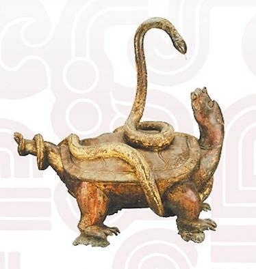玄武是“四神”中的北方之神。《大戴禮》:“龜上彎象天,下平法地。千載神龜,問無不知,廣育無雄,以蛇為雄。故龜與蛇合謂玄武”。因此龜蛇形象的組合亦有陰陽交接之意。除了瓦當、畫像磚、雕塑外,古人還常將此二物繪于旗上,用于指揮軍隊、消災避害之用。