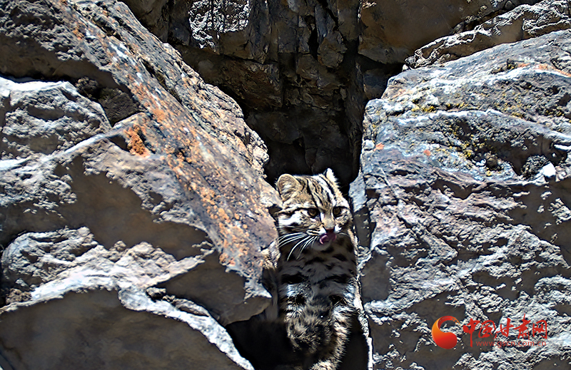 午后陽(yáng)光穿透云層,灑在祁連山斑駁的巖壁上,一只豹貓?zhí)匠隽嗣兹椎哪X袋,它身披棕黃色與灰黑相間的斑紋皮毛,琥珀色的瞳孔閃爍著機(jī)敏的光芒,小家伙在警惕周?chē)耐瑫r(shí),愜意的弓背伸爪舒展身軀,享受著溫暖的日光。