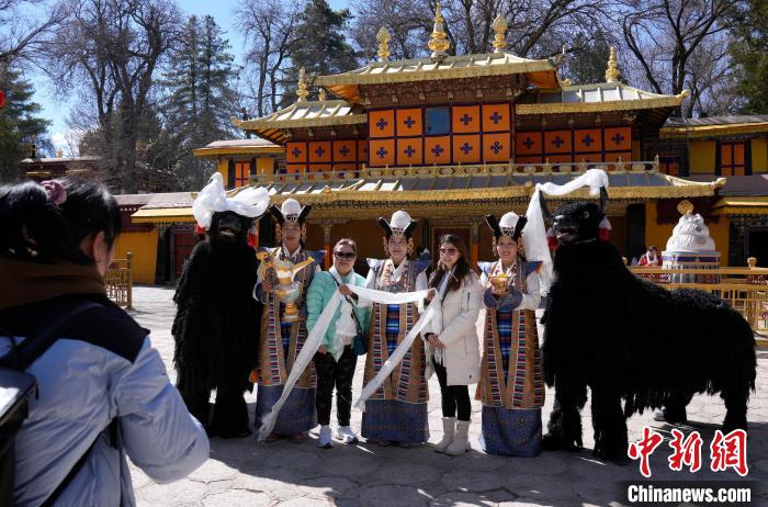 圖為歡迎儀式現(xiàn)場,香港游客在羅布林卡與工作人員合影留念。中新社記者 李林 攝