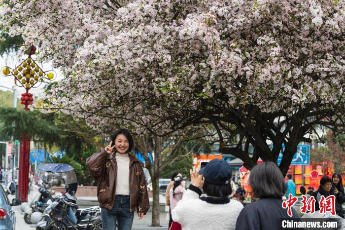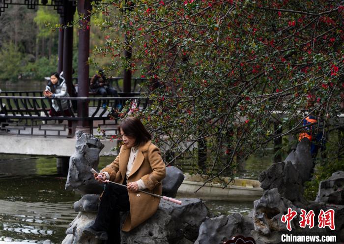圖為3月16日,市民準(zhǔn)備在棠湖公園內(nèi)的海棠樹下自拍。韓金雨 攝