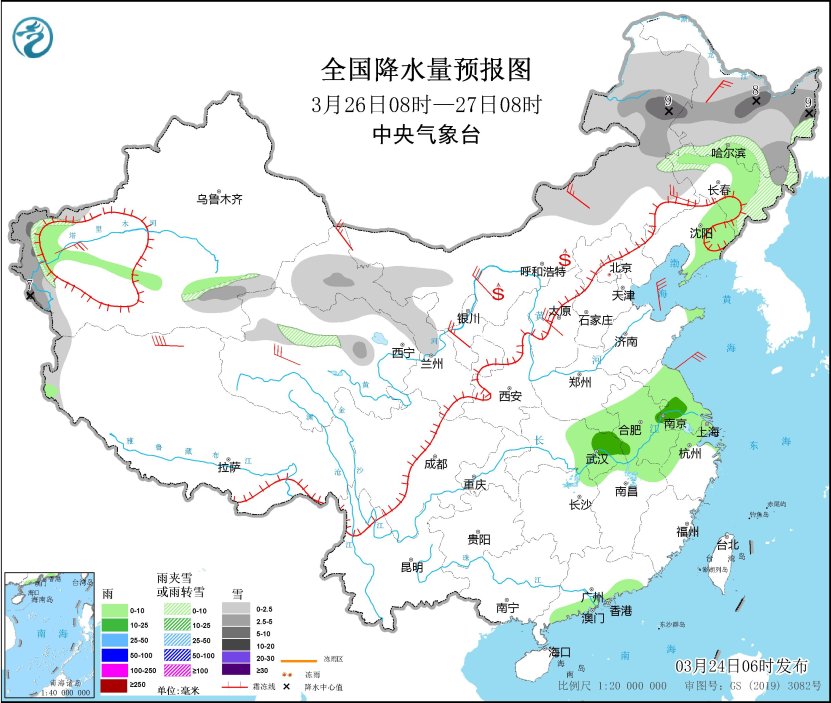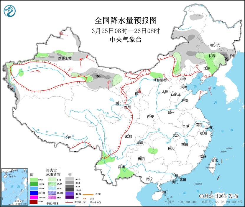 3月25日08時(shí)至26日08時(shí),新疆沿天山地區(qū)、內(nèi)蒙古西北部和東部、吉林大部、甘肅河西等地部分地區(qū)有小到中雪或雨夾雪,其中,吉林東部、新疆南疆西部山區(qū)、甘肅北部等地部分地區(qū)有大雪(5~8毫米)。新疆伊犁河谷、內(nèi)蒙古中部、吉林中部、遼寧東部、河北北部、湖南西部、貴州東北部、云南西北部和東南部等地部分地區(qū)有小雨。內(nèi)蒙古中西部、遼寧西部、山東半島、新疆東部、甘肅北部等地部分地區(qū)有4~6級(jí)風(fēng),新疆山口地區(qū)陣風(fēng)風(fēng)力8~9級(jí)。內(nèi)蒙古中西部、甘肅河西、寧夏等地部分地區(qū)有揚(yáng)沙。