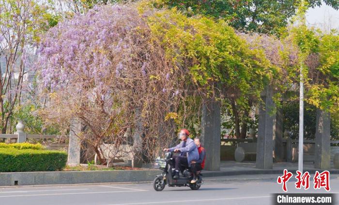 近日,廣西賀州市北堤公園的紫藤花迎春盛放,一串串紫藤花垂掛枝頭,花朵飽滿可愛,在綠色枝葉的掩映下,呈現(xiàn)出一派朝氣蓬勃的景象。圖為市民從紫藤花下路過。覃麗華  攝