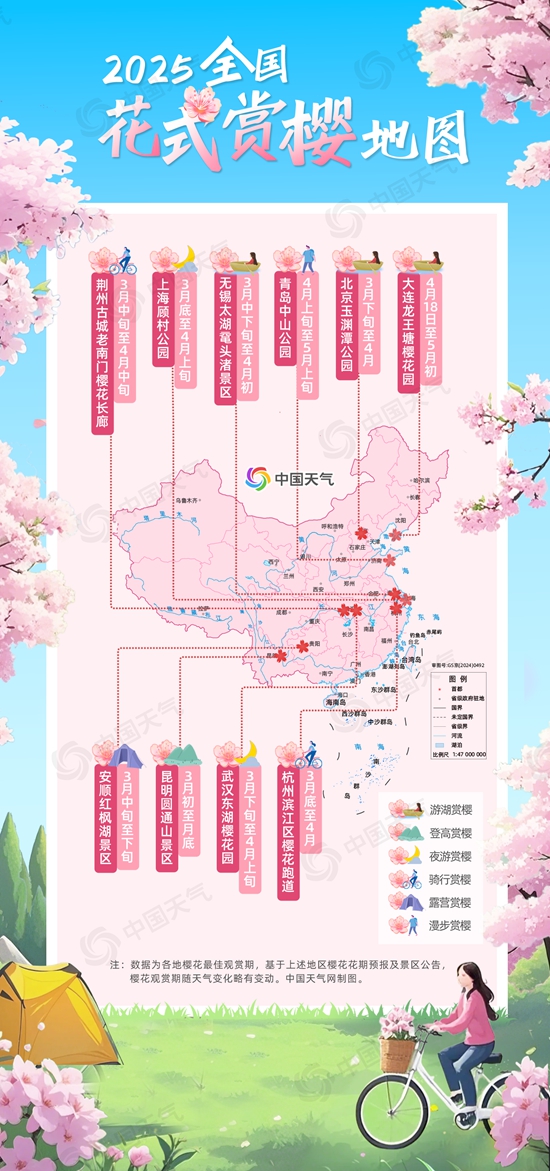 “櫻花紅陌上,柳葉綠池邊。”又是一年櫻花季!今年3月中下旬以來(lái),我國(guó)大部經(jīng)歷了大回暖,催動(dòng)春花盛放,目前武漢、南京等地櫻花已進(jìn)入盛花期,北方多地櫻花也開(kāi)始迎來(lái)觀賞期。中國(guó)天氣網(wǎng)特別推出2025全國(guó)花式賞櫻地圖,盤(pán)點(diǎn)十大賞櫻勝地最佳觀賞期和花式玩法,快來(lái)開(kāi)啟你的賞櫻之旅吧。