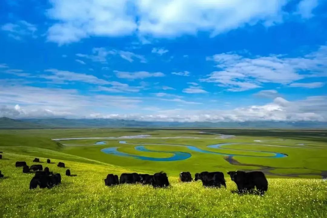 牦牛群如黑珍珠般散落于天際