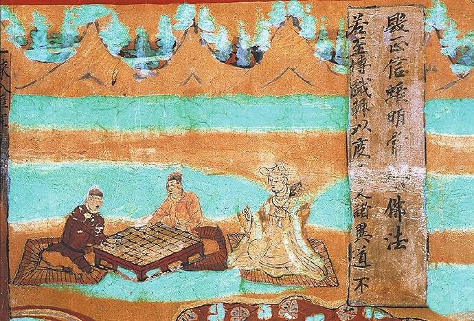 在敦煌壁畫中有關(guān)對弈的內(nèi)容較多。在莫高窟第454窟、第7窟壁畫中都有“弈棋圖”。兩幅圖的畫面有不少類似的地方:一是畫師較為突出棋盤的位置,兩幅壁畫中的棋盤都居中且形制相對巨大;二是畫面上的人物均為三人,兩人對弈,一人觀戰(zhàn),“觀棋不語真君子”;三是對弈者身后的景色都是天朗氣清、遠山含黛。據(jù)說,一天,北宋大文豪蘇東坡與摯友黃庭堅正在松樹底下弈棋。一陣風(fēng)吹來,松果掉進棋盤。蘇東坡隨即吟道:“松下圍棋,松子每隨棋子落。”黃庭堅馬上回答道:“柳邊垂釣,柳絲常伴釣絲懸。”雅趣十足。其實,棋局里的一動一靜、一招一式無不需要謹(jǐn)小慎微、穩(wěn)扎穩(wěn)打。而對弈時的當(dāng)斷則斷、示假隱真、有效合作等戰(zhàn)術(shù)不僅是對弈的智慧,也是人生的哲理吧。