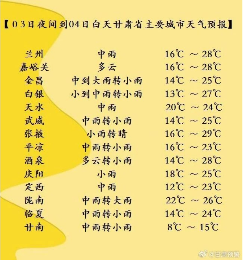 今天夜間到明天白天(7月3日20時-7月4日20時),酒泉、嘉峪關、張掖三市多云間陰,局部地方有小雨,祁連山區(qū)有中到大雨;省內其余地方陰有小到中雨,其中隴南、天水、平?jīng)?、慶陽等市局部地方及定西、甘南兩市州東部、白銀市南部有暴雨。