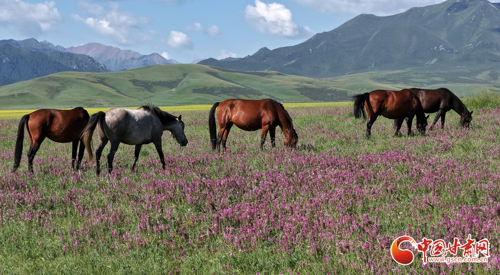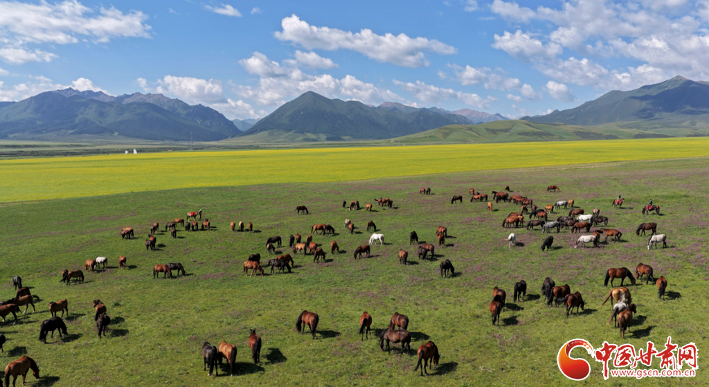 8月12日,在張掖山丹馬場(chǎng),一場(chǎng)駿馬奔騰的壯闊景象震撼上演。藍(lán)天如洗,白云似絮,遠(yuǎn)處連綿的山巒勾勒出雄渾的天際線,腳下黃綠交織的草原如巨幅織錦般鋪展。成群棕白相間的駿馬,似靈動(dòng)音符躍動(dòng)于綠野,騎手身姿矯健,與奔騰的馬群、遼闊的天地渾然一體,盡顯草原的壯美景象。