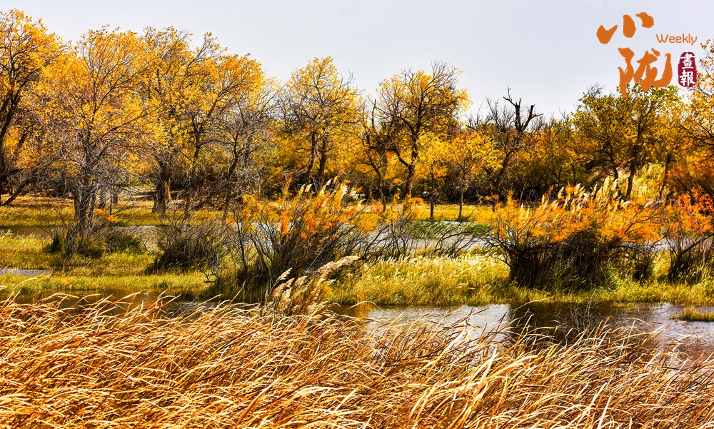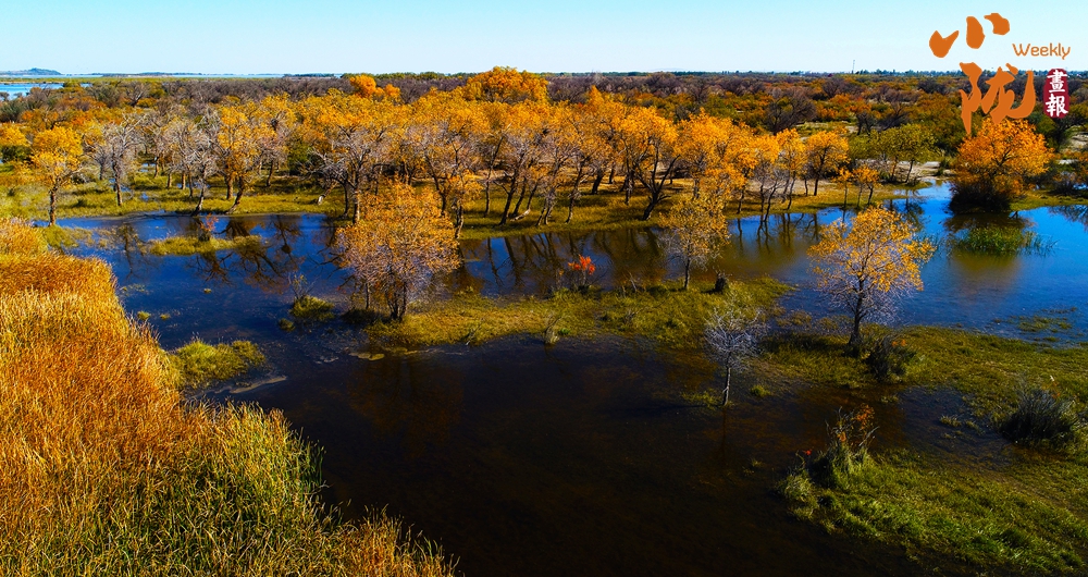 金色胡楊在陽光下泛著溫暖光澤,斑斕絢麗的蘆葦如金色絲帶點綴荒漠,與碧綠河水、湛藍天空構(gòu)成濃墨重彩的秋日圖景。