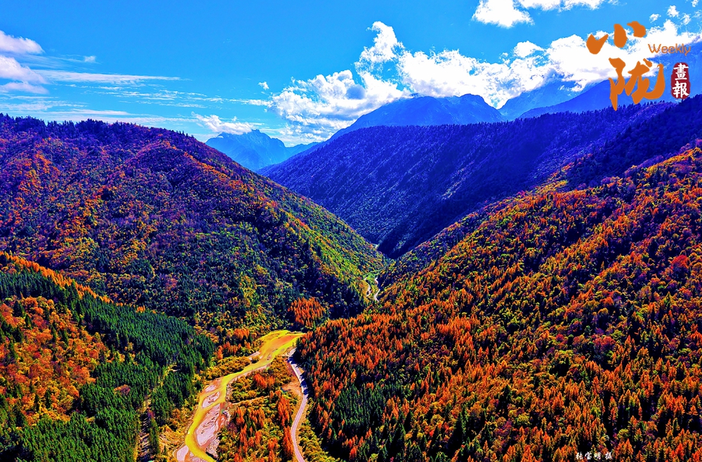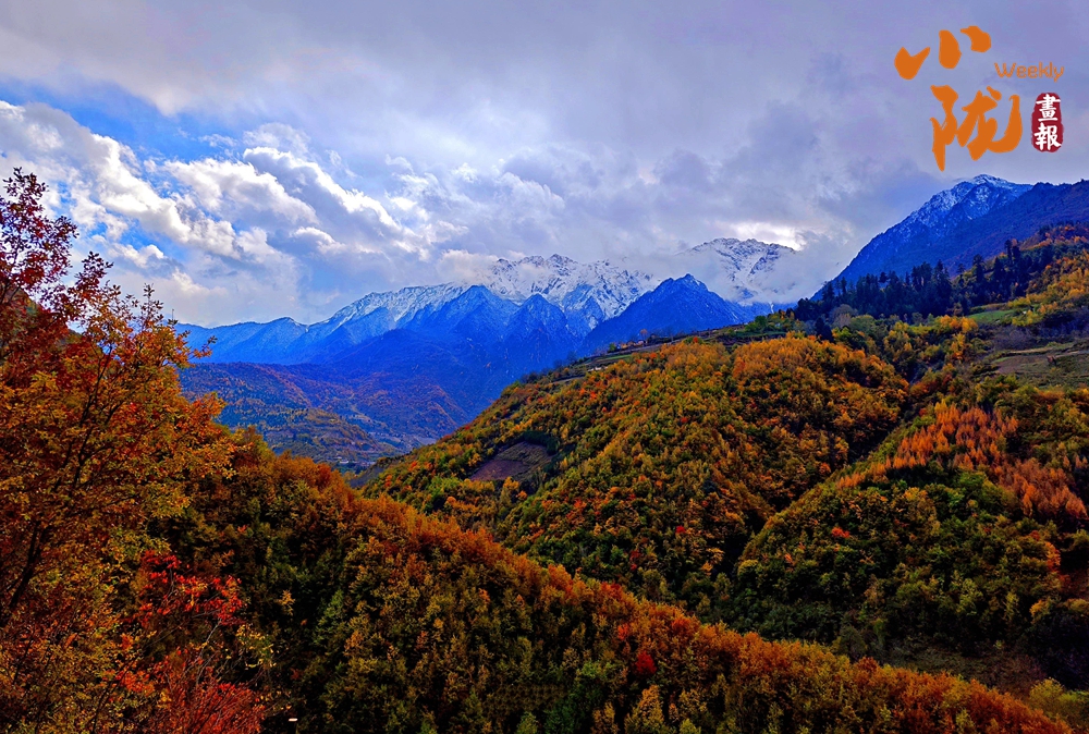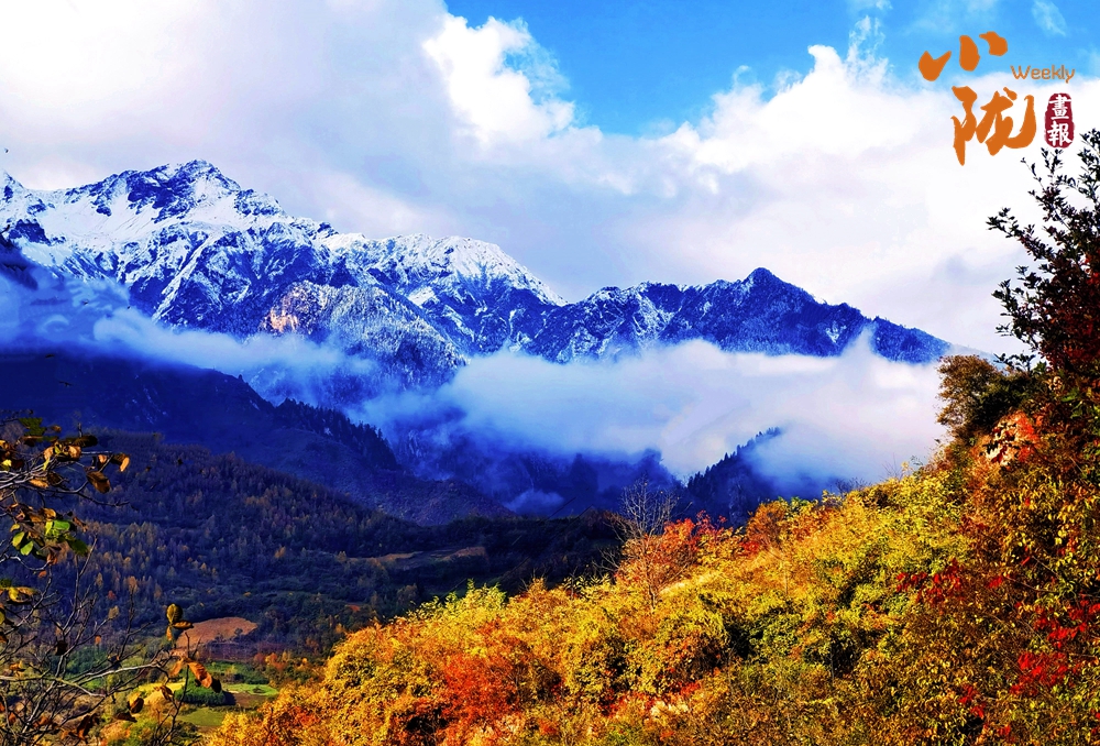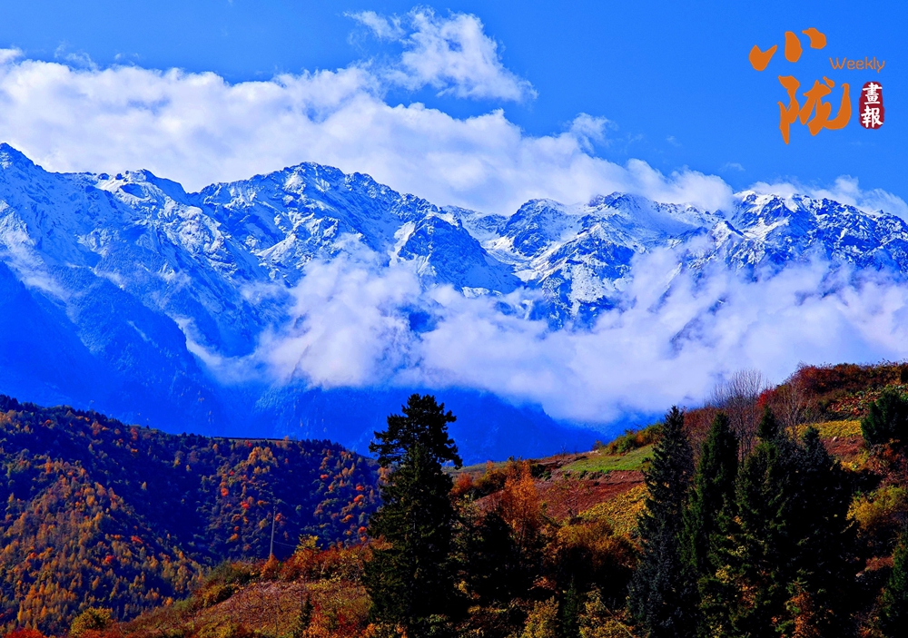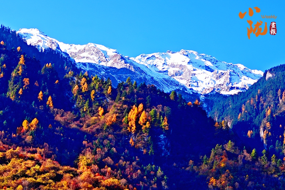 山巔的白雪與彩林形成鮮明對(duì)比,紅與黃,白與藍(lán),在陽光的映照下,共同編織出一幅溫柔而夢(mèng)幻的畫卷。