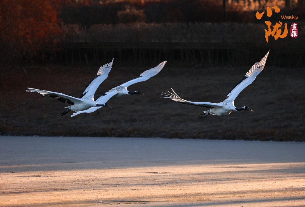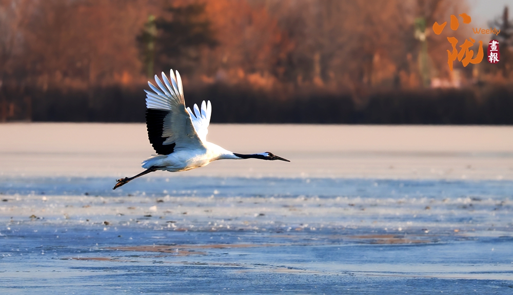 冰面映照著澄澈藍(lán)天,丹頂鶴展翅掠水,引頸高歌,清脆的鳴叫聲仿佛是大自然奏響的美妙樂(lè)章。