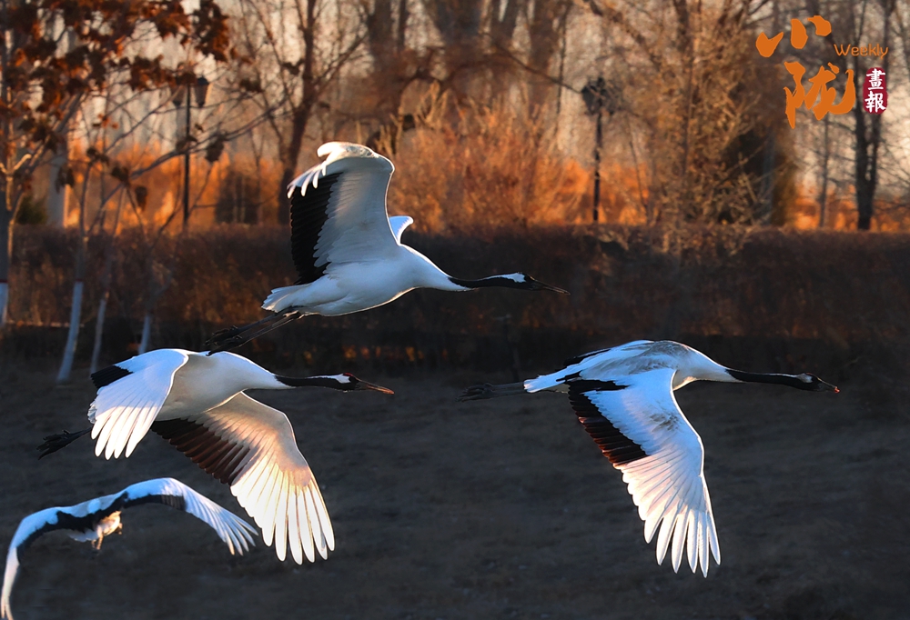 金色的蘆葦坡上均能看到它們優(yōu)雅的身影。這里,除了丹頂鶴,還有天鵝、綠頭鴨、斑頭雁等很多水鳥(niǎo),它們的倩影成為濕地冬日里最動(dòng)人的靈動(dòng)色彩。