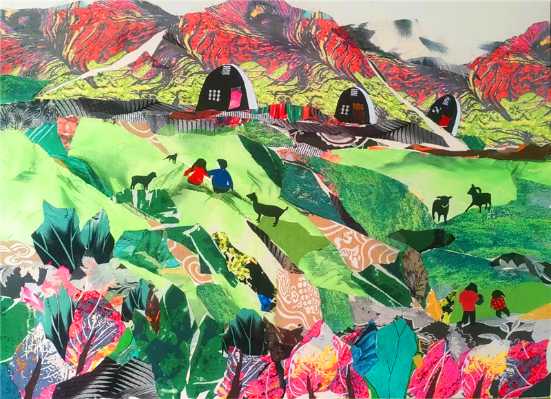 裁剪環(huán)節(jié)更見功力。她以“銳利”之心駕馭剪刀,根據(jù)畫面需求將碎布剪成不同形狀,有的需棱角分明,有的要圓潤柔和。粘貼時(shí),她摒棄簡(jiǎn)單的粘合方式,采用傳統(tǒng)縫補(bǔ)與現(xiàn)代鑲嵌相結(jié)合的技法,讓布料與底板緊密貼合,既保證了作品的耐久性,又營造出自然的浮雕感。在《黃土風(fēng)情》布貼畫中,她用層層疊疊的碎布表現(xiàn)黃土高原的溝壑縱橫,用深淺不一的色塊勾勒窯洞的錯(cuò)落有致,指尖翻飛間,碎布頭便有了筋骨與神韻。