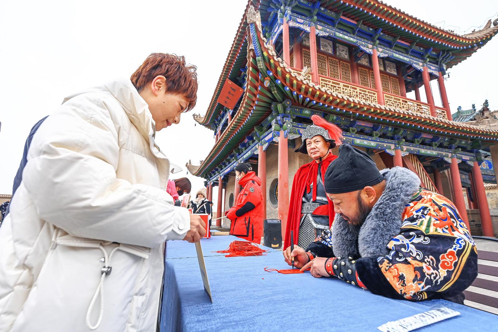 “雄關(guān)迎瑞 歡度新春”。春節(jié)假期,嘉峪關(guān)關(guān)城景區(qū)組織開展尋寶探秘、關(guān)長賜福等多項互動活動,在歡聲笑語中為游客送上新春祝福。(記者 徐霏 李巍 攝)