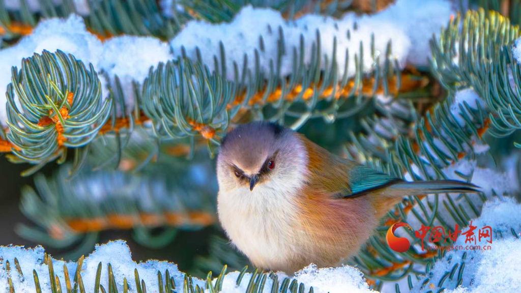 這群被譽(yù)為“祁連山精靈”的小鳥,頭頂雪白羽冠蓬松如絨,仿佛戴上了一頂天然的小絨帽,棕紅面頰溫潤似玉,在陽光下泛著柔和的光澤,藍(lán)綠背羽如同上好的寶石,在雪色映襯下泛著金屬般的質(zhì)感。淡粉與橙白相間的腹羽柔和雅致,層次分明,在純白背景的映襯下,形成強(qiáng)烈而和諧的視覺碰撞,它們或亭亭立于覆雪松枝,或靈巧穿梭于松針間隙,更有靈動的個體俯身探喙,啄取松針縫隙里的昆蟲,一聲輕脆的啄擊,劃破林間的清寂,卻更顯山野幽靜,羽翼輕振間,將“雪中覓食”的鮮活圖景永久定格。